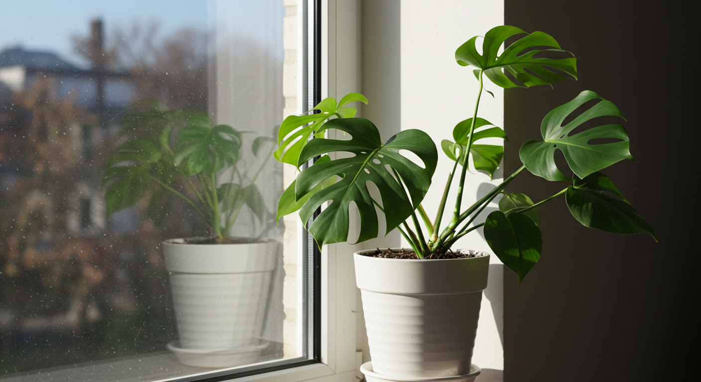 가장 좋은 건 밝은 간접광이야. 창가에 두되, 해가 직접 내리쬐지 않는 곳이나 혹은 얇은 커튼을 한 번 거쳐서 들어오는 빛이 딱이야. 빛이 너무 부족하면 잎에 멋진 구멍(찢어짐)이 잘 안 생기고, 줄기만 길게 웃자랄 수도 있으니 적당한 밝기가 중요해. 창가 근처 밝은 곳에 자리를 잡아주는 게 좋겠지?