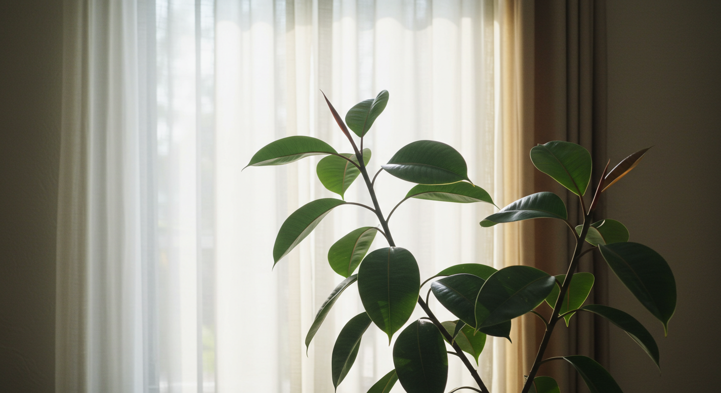 고무나무는 밝은 빛 좋아하지만, 뜨거운 직사광선은 잎을 태워. 창가에 두되, 직사광선 안 드는 곳, 커튼으로 걸러지는 '밝은 간접광'이 제일 좋아. 너무 어두우면 잎이 힘없어지니 피하자.