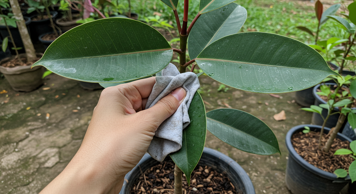 고무나무 잎은 넓어서 먼지가 잘 쌓여. 먼지 쌓이면 광합성 방해받고 안 예쁘지. 부드러운 천에 물 살짝 묻혀서 잎 앞뒤로 부드럽게 닦아줘 봐. 잎이 깨끗해지면 식물도 좋아하고 윤기도 반짝거릴 거야.