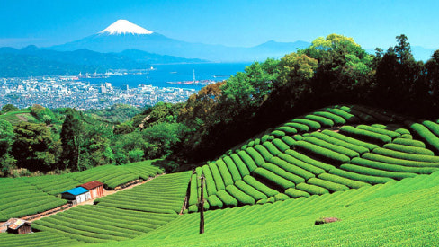 [사진: 마키노하라 차밭의 푸르른 풍경 / 계단식으로 펼쳐진 녹차 농장]