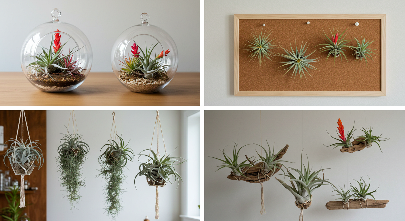유리 볼 또는 테라리움: 투명한 유리 용기에 틸란드시아와 자갈, 조개껍데기 등을 넣어 미니 정원을 만들어봐. 습도 유지에도 도움이 돼.