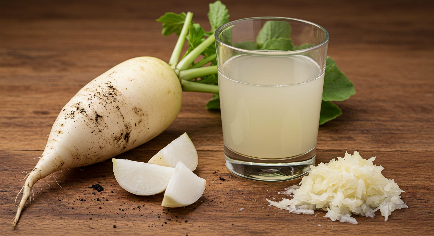 생으로 갈아 마시기: 소화 효소를 가장 온전히 섭취하는 방법이야. 무를 깨끗이 씻어 껍질째 갈아서 즙으로 마셔봐. 쓴맛이 느껴진다면 꿀을 조금 넣어 마시는 것도 괜찮아.