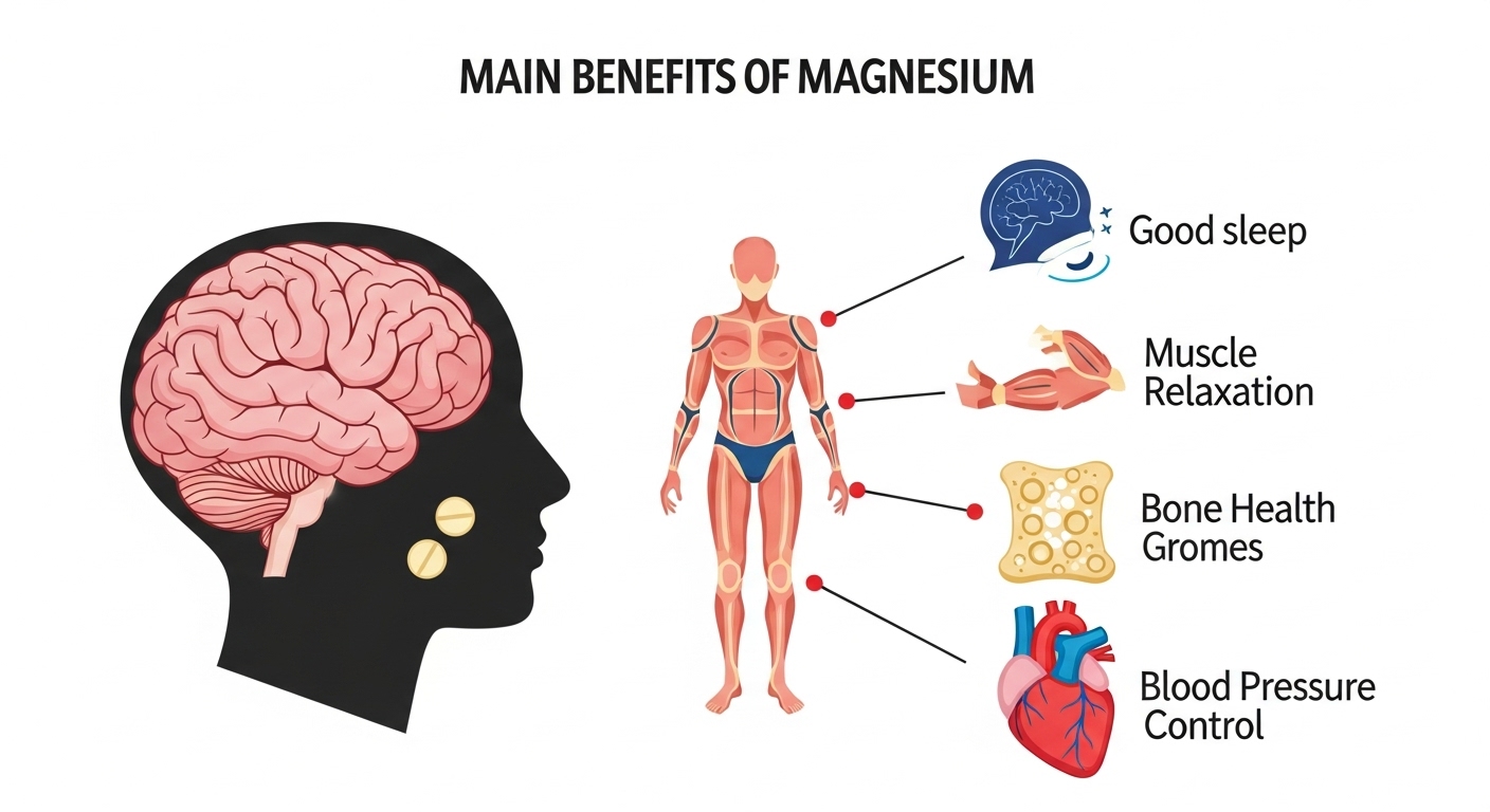 마그네슘은 우리 몸에서 약 300가지 이상의 효소 반응에 필수적인 역할을 해. 말 그대로 전신 건강에 영향을 미친다고 보면 돼. 대표적인 효능 몇 가지만 짚어볼까?