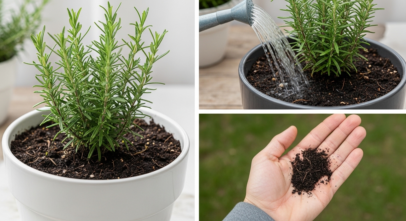 로즈마리는 건조하게 키우는 게 훨씬 잘 자라. 과습은 로즈마리의 가장 큰 적이라고 할 수 있어. 흙이 완전히 마른 다음에 물을 주는 게 원칙이야. 겉흙이 마르는 걸 넘어 화분 속 흙까지 완전히 마른 것 같을 때 듬뿍 주면 돼. 물을 줄 때는 화분 밑으로 물이 흘러나올 때까지 충분히 주는 게 좋고, 물받이에 고인 물은 바로 버려야 뿌리가 썩는 걸 방지할 수 있어. 혹시 흙이 마른 건지 헷갈린다면 손가락을 흙에 찔러 넣어보고 판단하는 것도 좋은 방법이야.