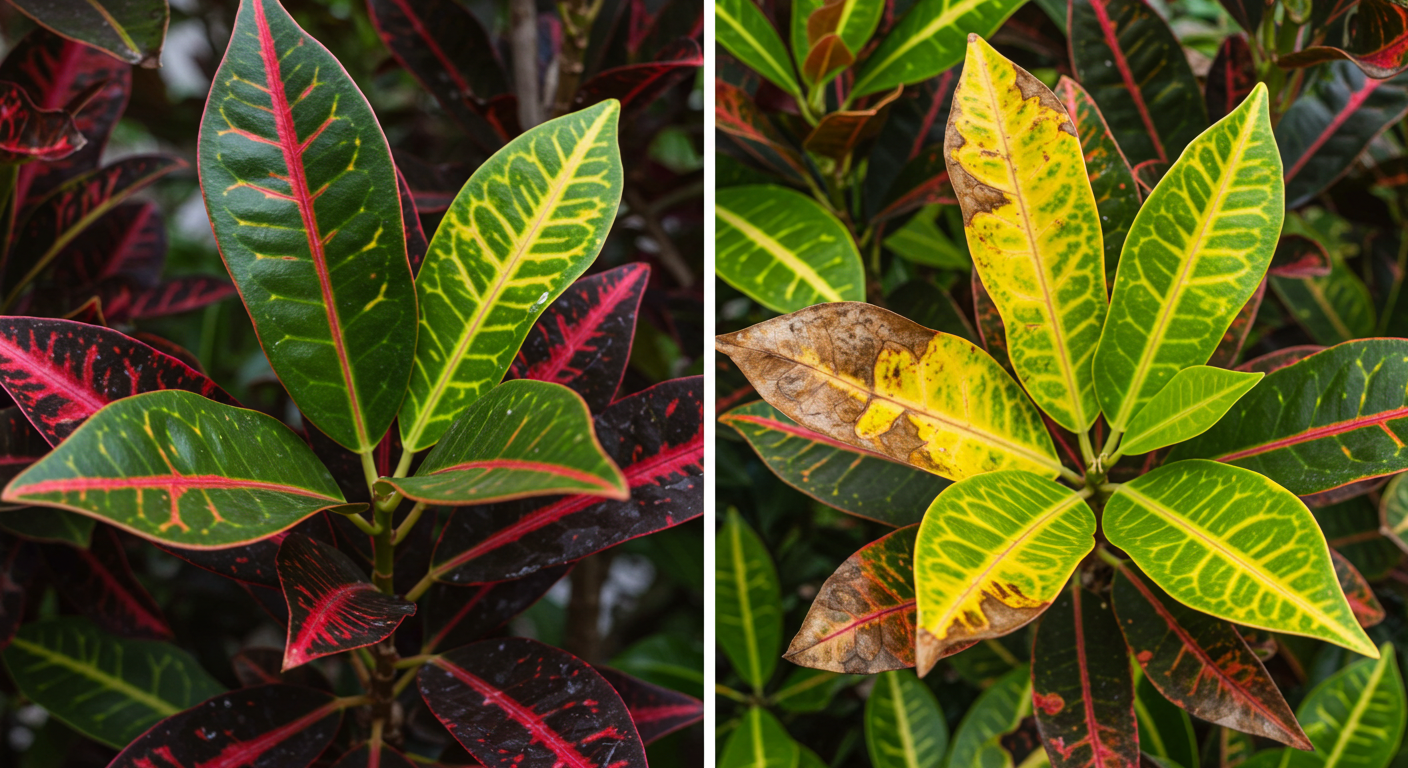 - 햇빛 부족: 크로톤은 햇빛이 부족하면 잎 색깔이 흐려지고 무늬가 선명해지지 않아. 더 밝은 곳으로 옮겨줘.