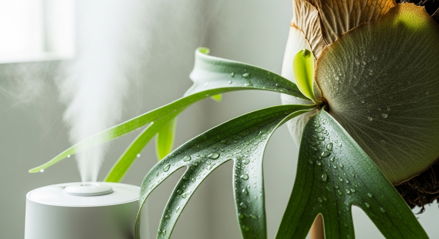 박쥐란은 열대식물이라 따뜻하고 습한 환경을 좋아해. 최적 온도는 20~25도 정도이고, 겨울철에도 10도 이하로 떨어지지 않게 관리하는 게 중요해. 습도는 50~70% 정도가 가장 이상적이야. 실내가 너무 건조하면 잎 끝이 마르거나 갈변할 수 있으니, 가습기를 틀어주거나 잎에 자주 분무해 주는 게 좋아. 다만, 분무할 때는 영양엽에 물이 너무 많이 고이지 않도록 조심해야 해.