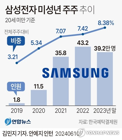 삼성전자의 미성년 주주 수는 2019년 3.21%에서 2021년부터 7~8%대를 유지하고 있어. 2022년 말에는 43만1642명으로 정점을 찍었고, 2023년에는 39만1869명으로 줄어들었어. 하지만 여전히 많은 젊은이들이 삼성전자 주식을 보유하고 있다는 사실은 긍정적이야.