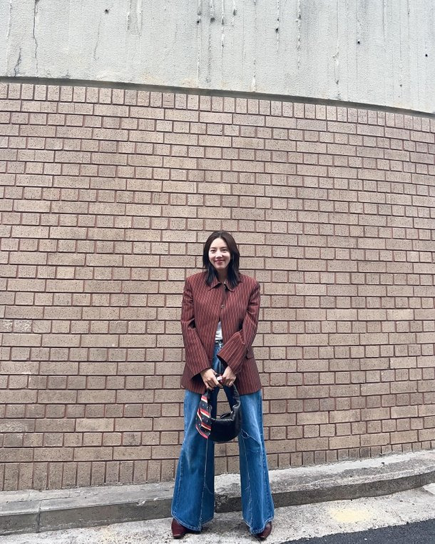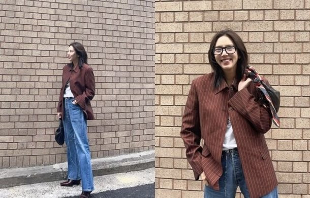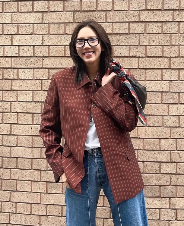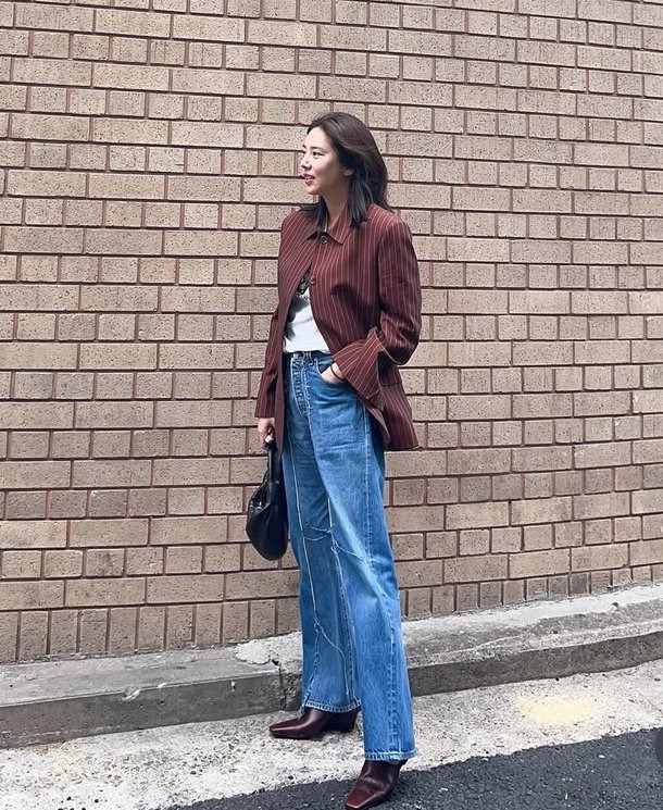 손담비는 보르도 컬러의 스트라이프 자켓을 매치했어. 이 자켓은 클래식하면서도 세련된 느낌을 주고, 청바지와의 조화가 정말 좋더라구. 자켓의 스트라이프 패턴이 시선을 끌고, 전체적인 룩을 더욱 스타일리시하게 만들어줘.